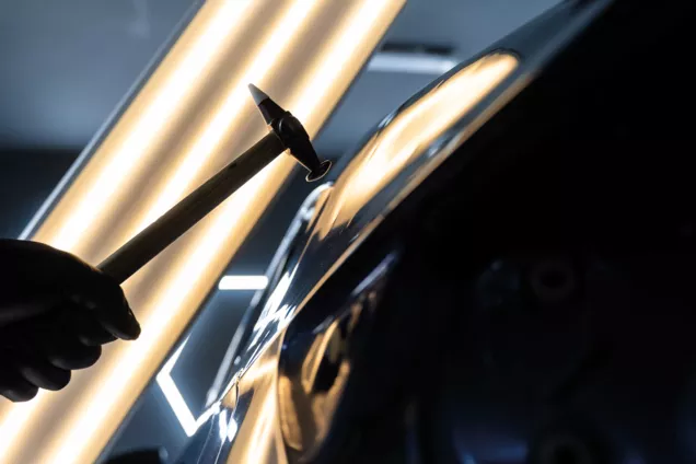 Durante la riparazione dei danni da grandine, le officine Garage plus e Carrosserie plus tirano e premono con cautela le ammaccature della carrozzeria senza danneggiare la vernice. Questa tecnica, che consente di riparare la carrozzeria senza stuccare o riverniciare, offre due vantaggi fondamentali: risparmio di tempo e una notevole riduzione dei costi di riparazione.